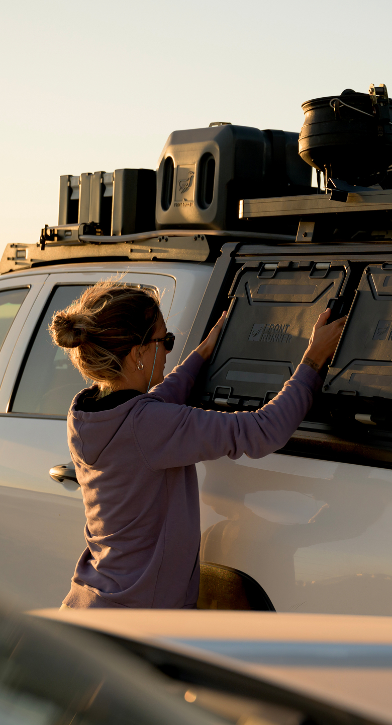 Les galeries de toit Front Runner Dometic font partie d’un système complet. Fixez glacières, rangements, éclairages et tentes – tout s’attache solidement pour vos aventures.